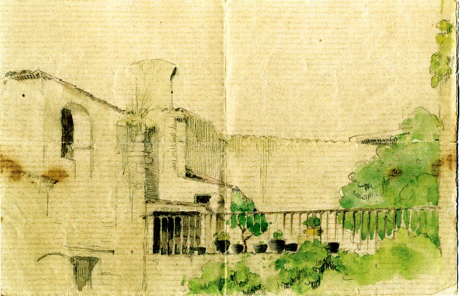 Còpia digital d'un full amb l'apunt a aquarel·la d'una de les terrasses del mas Bru