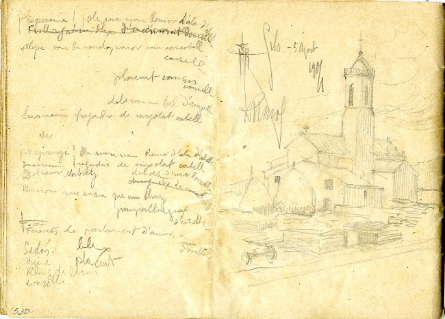 Sense títol [Dibuix de l'església de Sils / Esborrany de poema ]