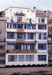 Pel que fa a l'exterior, a la façana de les Ballesteries, l'arquitecte, construeix un portal d'accés i unifica les alçades de les diferents cases; tot respectant els balcons i obertures del segle XIX. L'únic element que destaca és la tribuna volada del tercer pis. A la façana posterior, Masó construeix unes galeries sobre l'Onyar amb plafons ceràmics de color groc. En aquesta façana hi observem la llarga jardinera de ceràmica vidriada i les sanefes de rajoles amb les formes conegudes com aigua de la vida. En el pis superior la façana queda retirada i ofereix una diferència formal amb la resta de l'edifici.