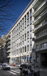 Construcció de plantra baixa i sis pisos on es combinen habitatges i oficines. El cos central disposa de llargues filades de finestres rectangulars, mentre als extrems es disposen els balcons. té planta rectangular. L'edifici acompleix una funció urbana especial, comunicant dues de les artèries amb més activitat comercial de la ciutat gràcies a dos passatges coberts de la planta baixa,. Fonamentalment presenta una estructura propera als plnatejaments neoracionalistes dels arquitectes italians de mitjan S. XX