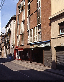 Edifici entre mitgeres amb baixos, quatre pisos i àtic. La façana es troba lleugerament esbiaixada en funció de la línia que marca el perímetre del carrer. el mur d'obra vista presenta obertures allargades verticals amb persianes correderes que varien la composició de conjunt segons si estàn obertes o tancades.