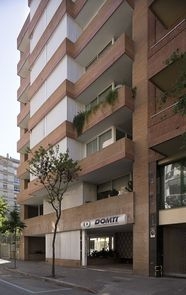 Edifici de PB i 7 i àtic reculat, formant terrassa en relació al carrer i on la barana fa de remat de l'edifici. Façana de composició simètrica d'obra vista i amb volat de balcons que es va esglaonant. els costats dels balcons són jardineres que aboquen a obertures de cambres per assolir la màxima llum en façana. Al mig dels balcons, en la part més volada, i simètricament respecte a tota la façana, hi ha una tribuna d'elements metàl.lics (lames) La PB i 1 actuen com a sòcol, matenint la composició d'obertures, però enrasades a façana. A PB es retallen l'accés a garatge i a botiga pels laterals, i accés habitatges pel mig, en la part posterior a les lames, on hi ha un parterre jardinera. La façana posterior és similar.