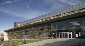 Edifici disposat en dos blocs lineals i transversals al vessant natural del terreny. La façana principal s'orienta a oest i els parasols de fusta matitzen la llum del capvespre.