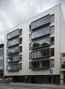 Edific amb baixos i sis plantes que es completa amb 3 plantes d'aparcament. El projecte contempla dos blocs, que dónen a dos carrers i un espai de planta baixa a l'interior de l'illa. La façana del carrer Barcelona harmonitza amb l'immoble veí, que és el garatge Forné-Ponsa.