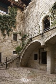 En els segles XIV-XV s'amplia l'edifici per la part posterior, bo i creant-se un pati central amb escalinata i galeria a la planta noble -model freqüent en la nostra arquitectura baix medieval-. Aquesta façana té una composició semblant a la de la principal i les arcades formaven part, molt probablement, d'un carrer porticat del qual se'n conserven restes en altres edificacions.