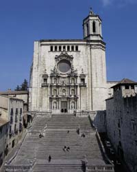 La catedral romànica, iniciada en el S. XI en el lloc ocupat per un primitiu temple d'origen romà, s'enderrocà en construir-se la nau gòtica actual. Tanmateix el claustre i el campanar, anomenat Torre de Carlemany, foren conservats fins avui.