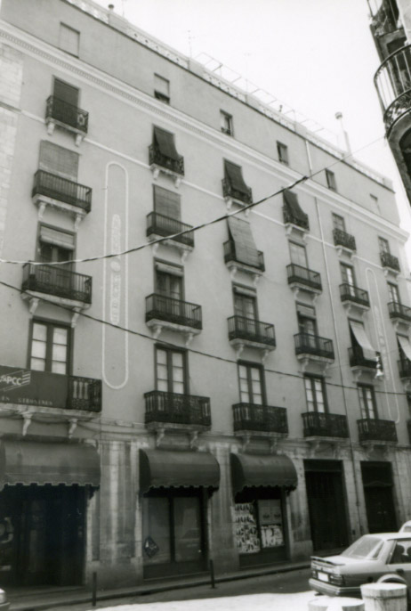 Vista general del edifici en cantonera, edificació de planta baixa i dues plantes que segueixen el model de composició clàssica de tres bandes horitzontals, rematats per una balaustrada .