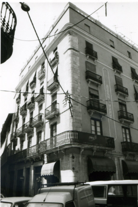Vista general del edifici en cantonera, edificació de planta baixa i dues plantes que segueixen el model de composició clàssica de tres bandes horitzontals, rematats per una balaustrada .