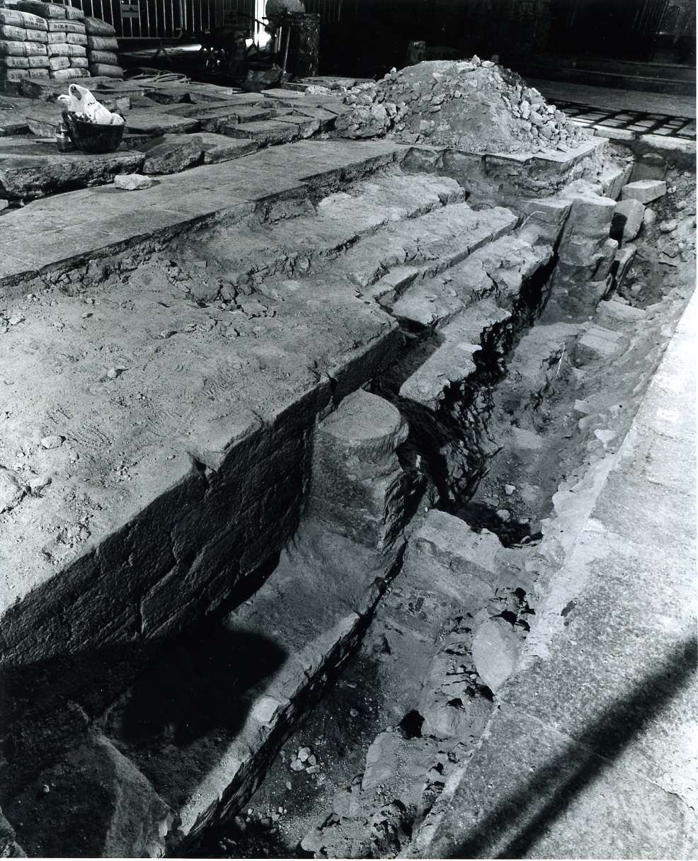 Imatges del basament , les escales i la base de les columnes de la portalada principal de la Catedral romànica, que es va enderrocar per a edificar la nau gòtica. Aquestes restes es van excavar el mes de febrer de 98 i van aparéixer immediatament a sota del paviment enllosat de la nau gòtica. Desprès es van tornar a cobrir.