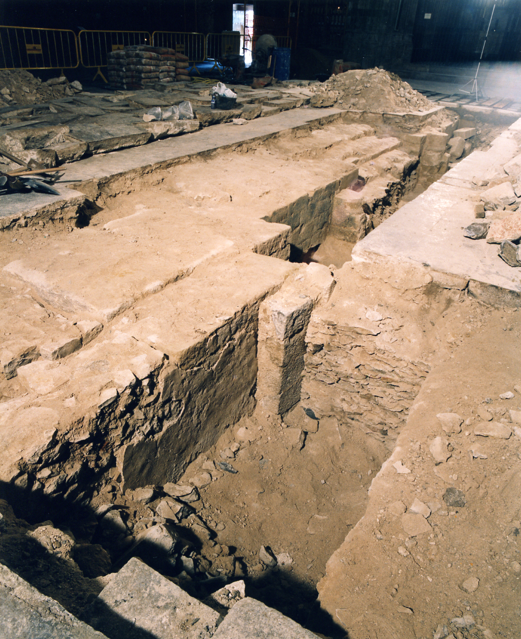 Imatges del basament , les escales i la base de les columnes de la portalada principal de la Catedral romànica, que es va enderrocar per a edificar la nau gòtica. Aquestes restes es van excavar el mes de febrer de 98 i van aparéixer immediatament a sota del paviment enllosat de la nau gòtica. Desprès es van tornar a cobrir.