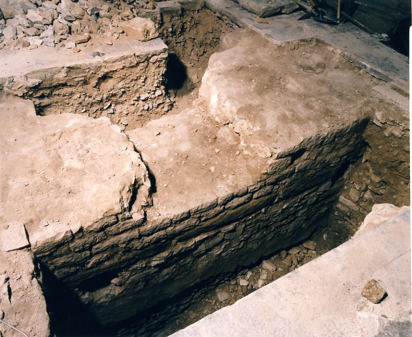 Imatges del basament , les escales i la base de les columnes de la portalada principal de la Catedral romànica, que es va enderrocar per a edificar la nau gòtica. Aquestes restes es van excavar el mes de febrer de 98 i van aparéixer immediatament a sota del paviment enllosat de la nau gòtica. Desprès es van tornar a cobrir.