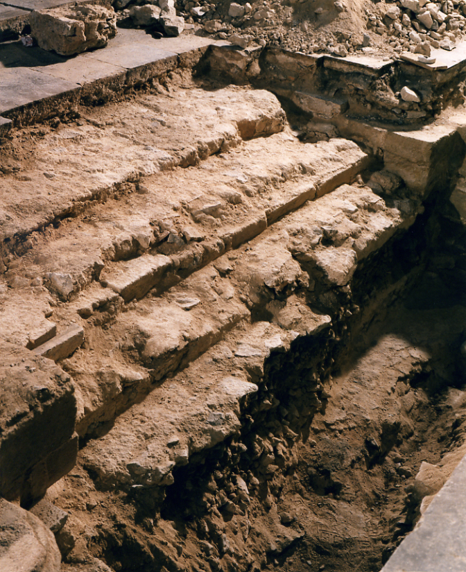 Imatges del basament , les escales i la base de les columnes de la portalada principal de la Catedral romànica, que es va enderrocar per a edificar la nau gòtica. Aquestes restes es van excavar el mes de febrer de 98 i van aparéixer immediatament a sota del paviment enllosat de la nau gòtica. Desprès es van tornar a cobrir.