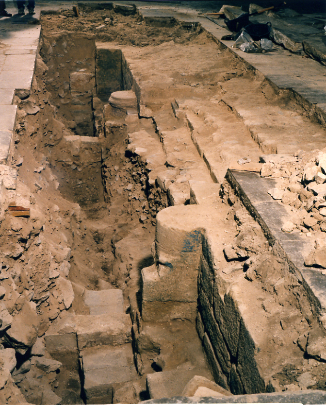 Imatges del basament , les escales i la base de les columnes de la portalada principal de la Catedral romànica, que es va enderrocar per a edificar la nau gòtica. Aquestes restes es van excavar el mes de febrer de 98 i van aparéixer immediatament a sota del paviment enllosat de la nau gòtica. Desprès es van tornar a cobrir.