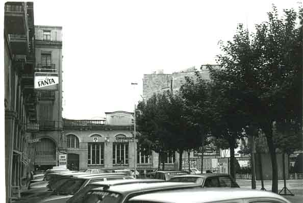 Vista de l'edifici i el seu entorn urbà. En el moment de la imatge, seu del local electoral de Convergència i Unió.