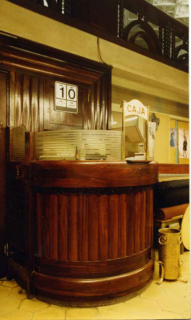 Vista de la caixa de la botiga, a remarcar la fusteria que la constitueix.