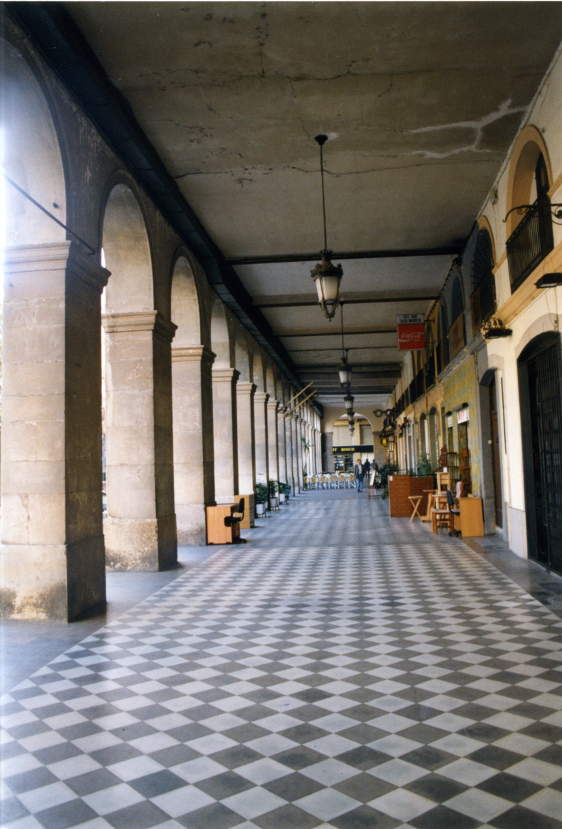 Vista interior del porxo de la plaça format per arcs de punt rodó i colummes de pedra polida