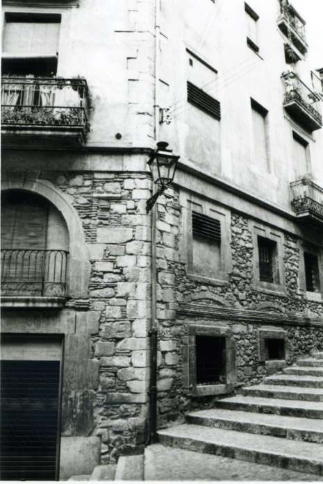 Vista de la cantonada del C/de la Força i les escales de la Pera de planta baixa , entresol tres plantes i sota coberta, l'entresol està format per obertures d'arcs de punt rodó que s'unifiquen amb els de planta baixa.Les obertures segueixen la composició de l'època, unificacions de balcons en les plantes més properes i reduint-se i separant-se en les plantes superiors. La façana es remata en cornisa i afegit. Acabats de llosanes de pedra, baranes de forja i estucat a façana.