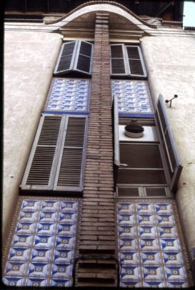 Detall de les finestres de la Gran Via i dels plafons ceràmics que les emmarquen.