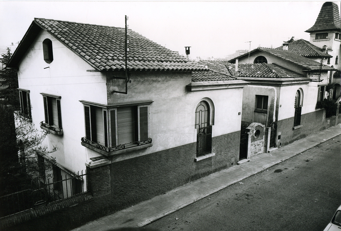 Vista del carrer Ibèria amb les cases econòmiques a primer terme i el xalet al fons.
