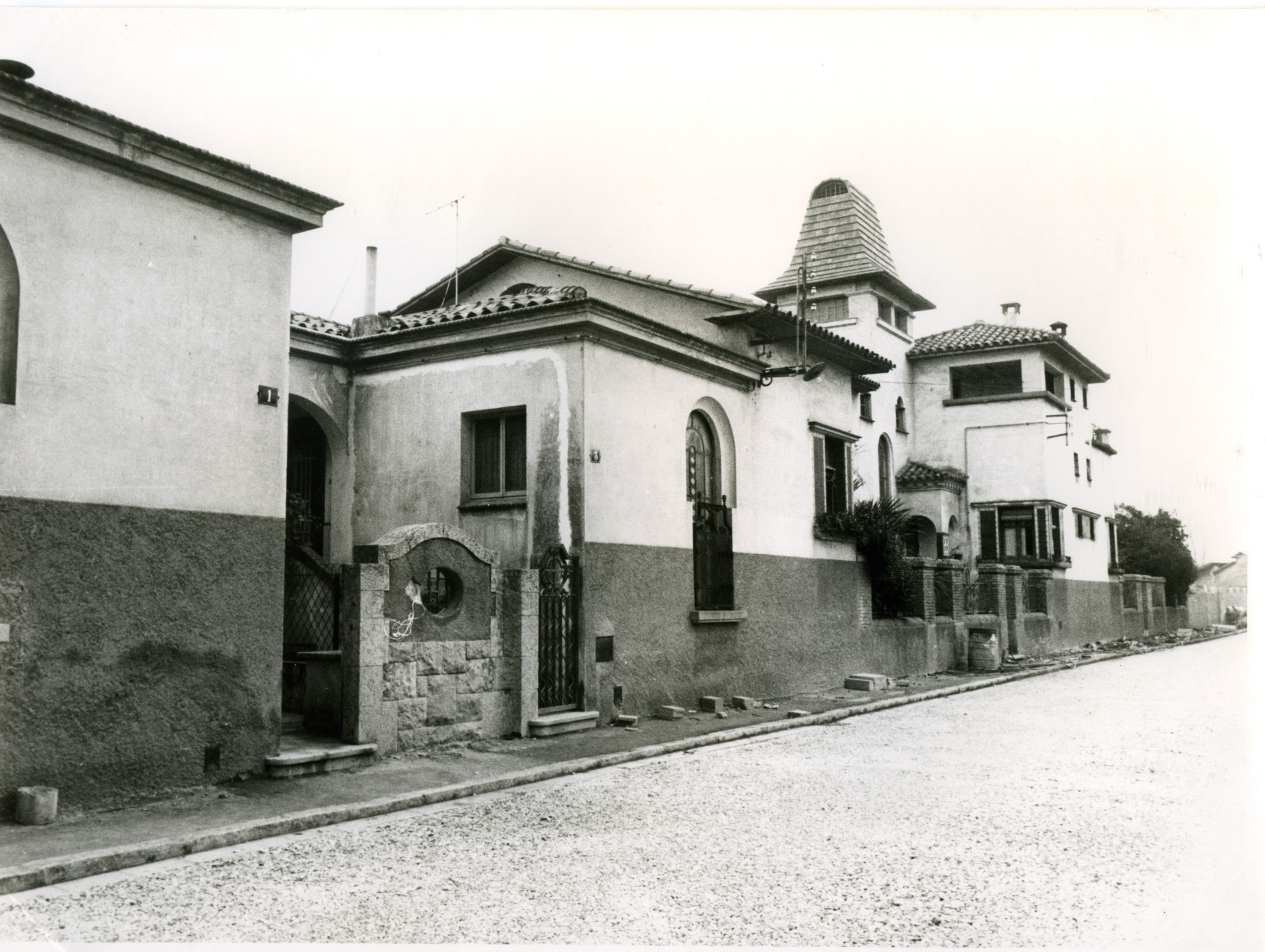 Vista del carrer Ibèria amb dues de les cases econòmiques a primer terme i el xalet al fons.
