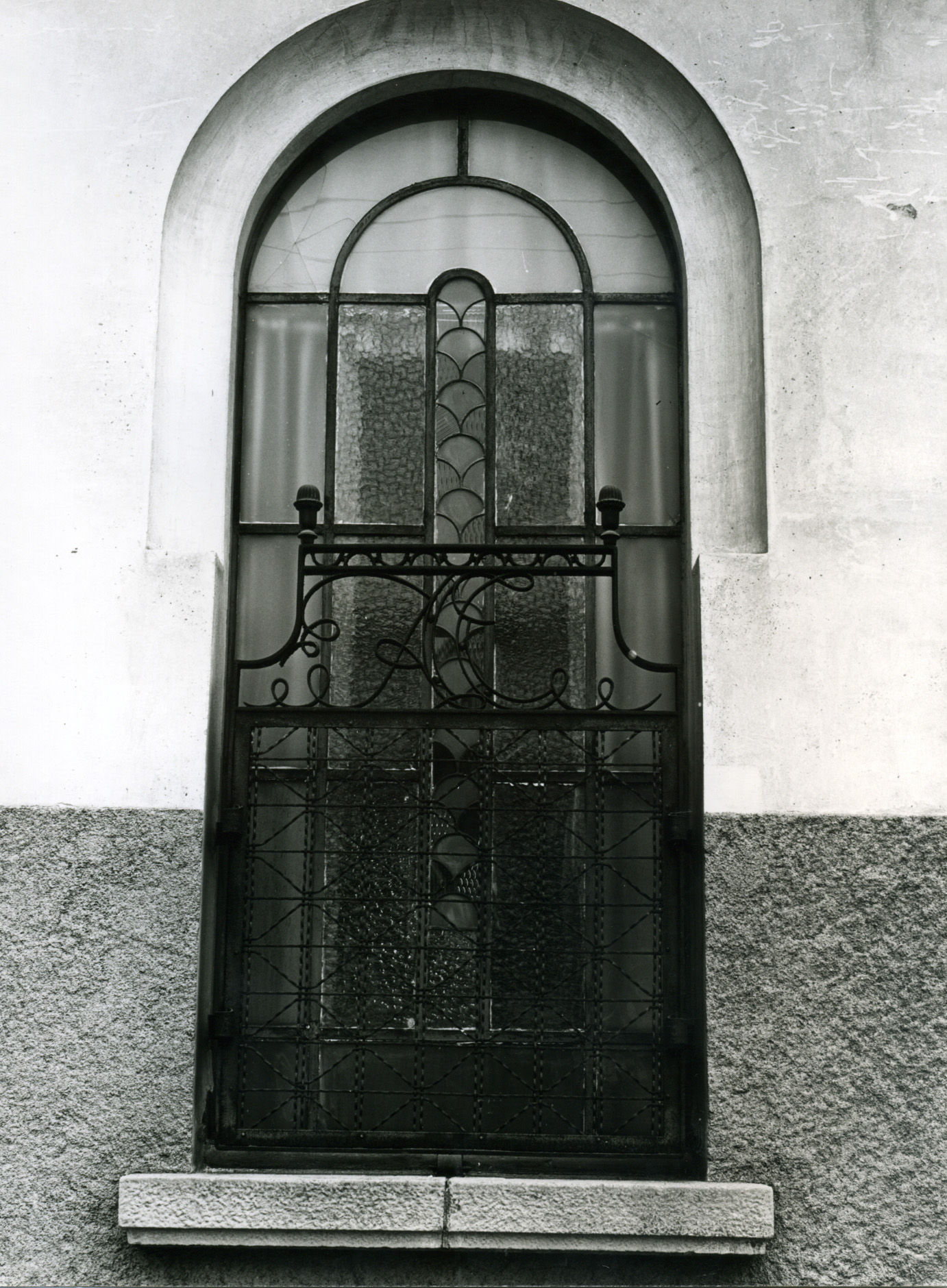 Detall d'una finestra on s'aprecia el treball de forja de la reixa amb les incials AT, referides al promotor Alfons Teixidor.