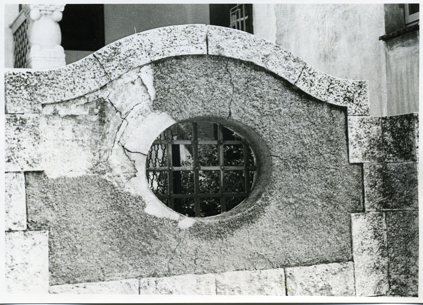 Detall de l'òcul decoratiu de la paret de tanca de les cases econòmiques de la urbanització.