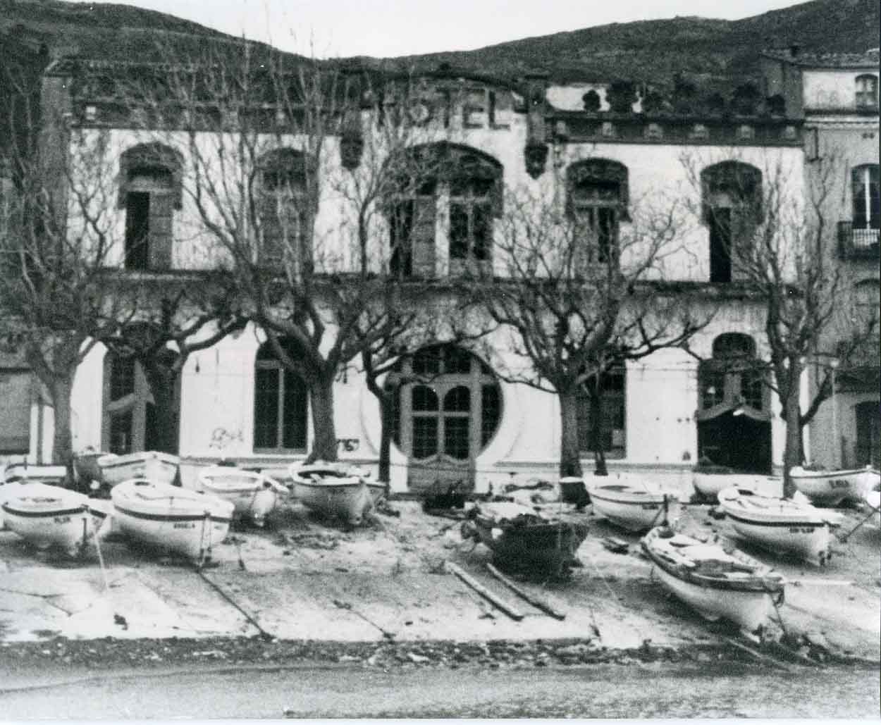 Perspectiva general de l'edifici amb la platja i les barques a primer terme.