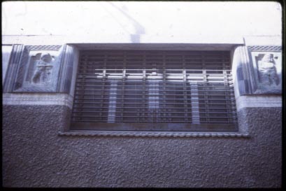 Detall d'una finestra flanquejada per dos dels plafons dels Oficis de Jaume Busquets