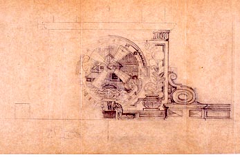 Dibuix per a l'esgrafiat amb el molí fariner, al·lusiu a l'ofici del seu propietari, que corona la torre.