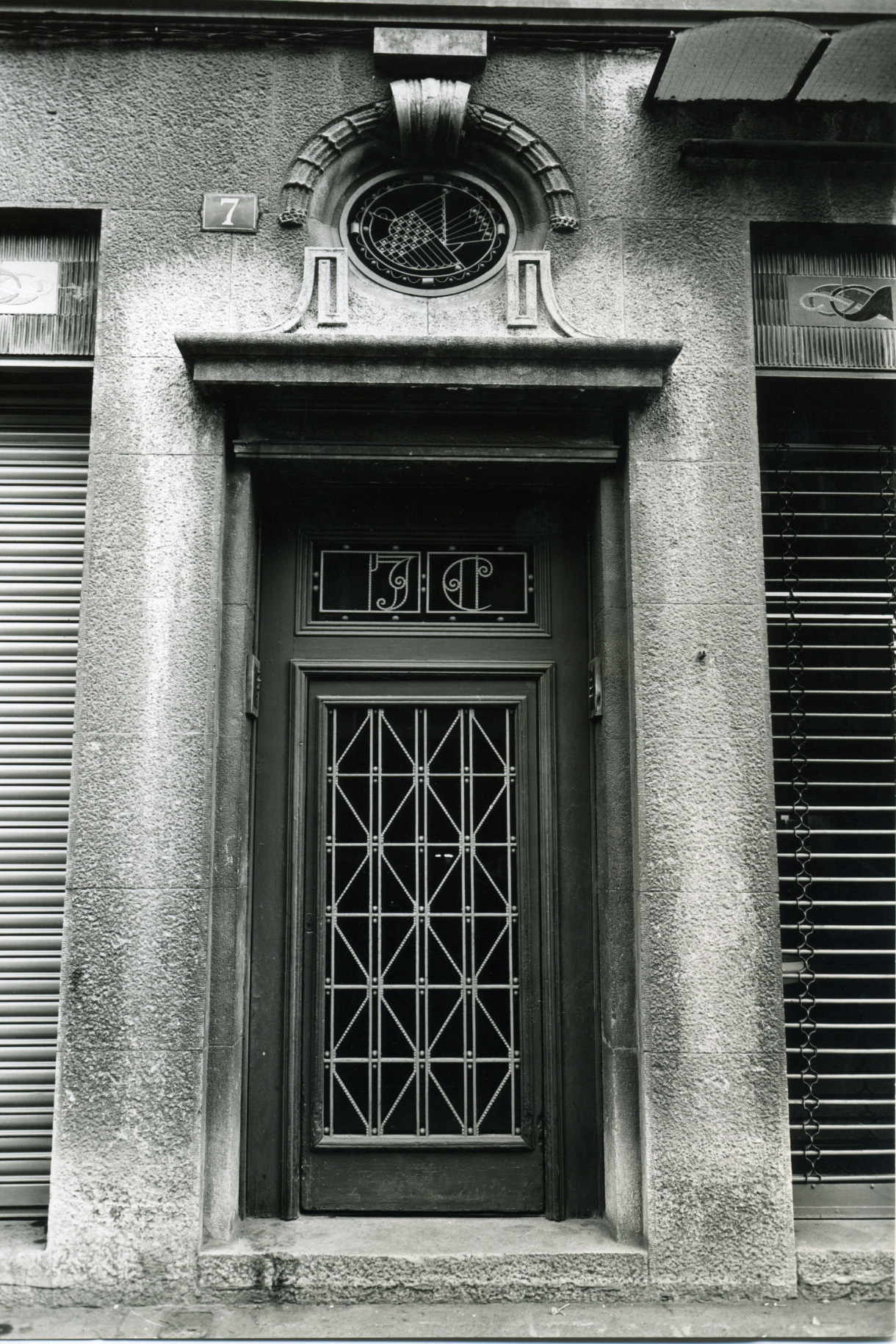 Detall de la porta d'entrada a l'edifici on s'aprecien les inicials del propietari i el colom que n'evoca el nom, tot realitzat en forja.