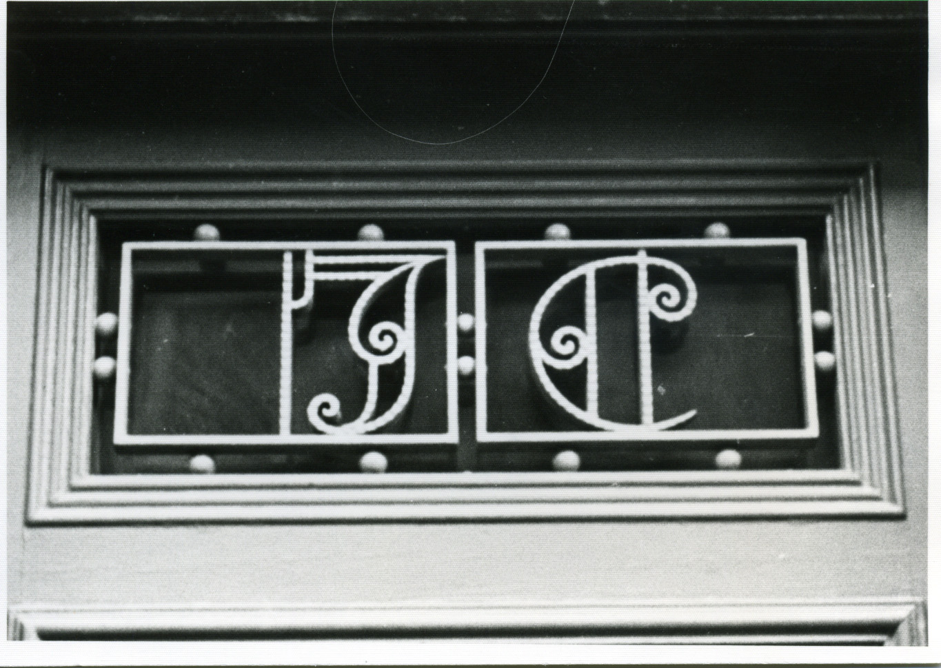 Detall de les inicials, en forja, de la porta d'entrada a l'edifici.