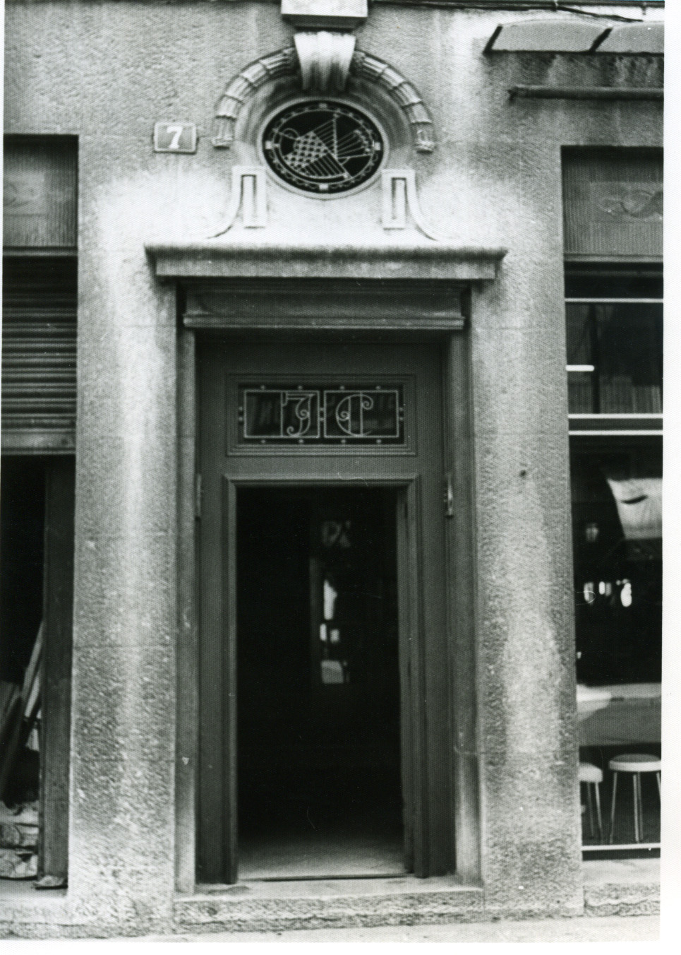 Detall de la porta d'entrada a l'edifici on s'aprecien les inicials del propietari i el colom que n'evoca el nom, tot realitzat en forja.