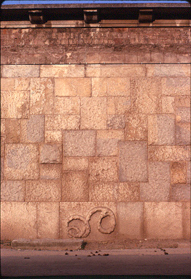 Detall de la paret de tanca en el tram on s'ha esculpit una serp en el sòcol.