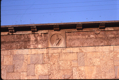 Detall de la paret de tanca en el tram on s'ha esculpit el símbol de la benedicció de Déu Pare en el fris de coronament.