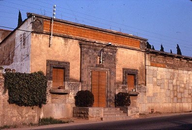 Perspectiva de la caseta del guarda, d'una de les construccions que flanquegen la paret de tanca del cementiri.