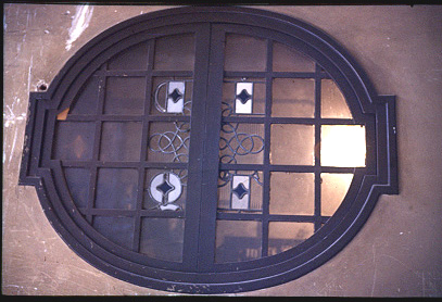 Vista d'una finestra ovalada amb vitralls del vestíbul.