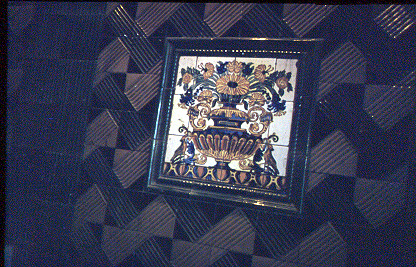 Detall d'un plafó ceràmic de l'escala.