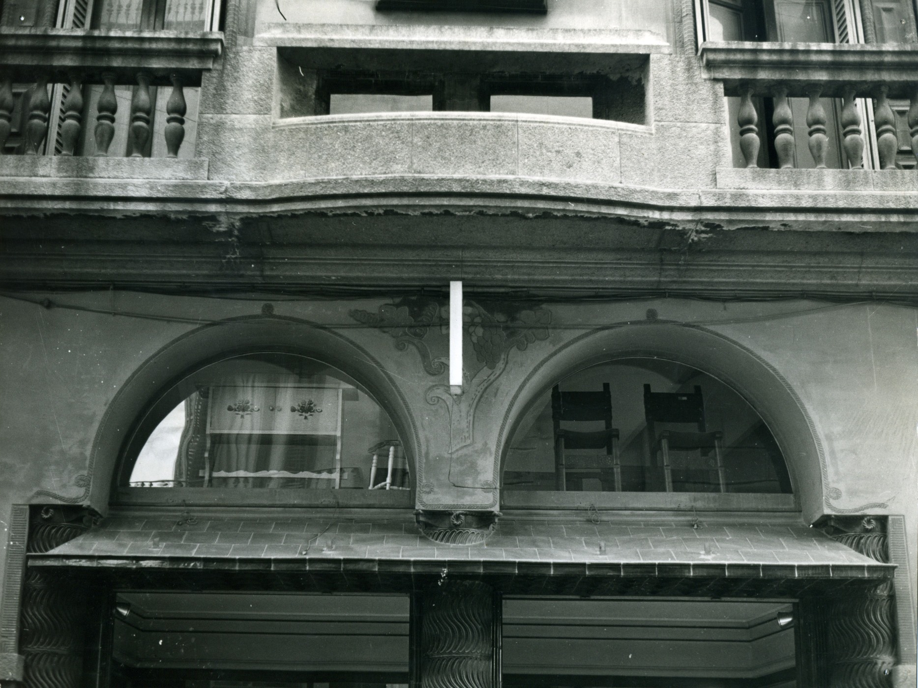 Detall de les obertures de l'entresol quan l'espai era ocupat per una botiga de mobles.