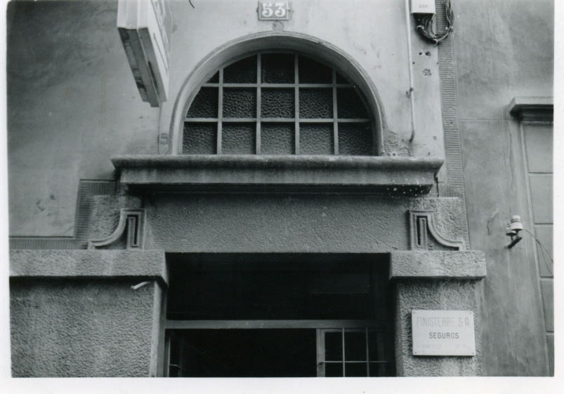 Detall de la finestra semicircular de sobre una de les portes d'entrada a l'edifici.