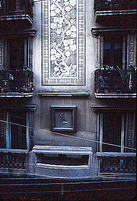 Detall de l'esgrafiat de la façana al·lusiu al comerç de vins establert als baixos.