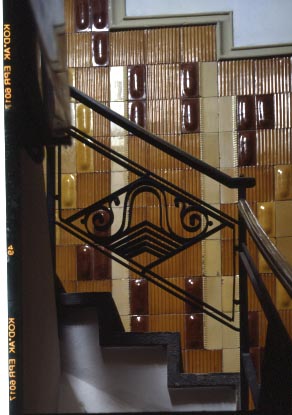 Detall d'un tram de l'escala on s'aprecia l'arramblador cerràmic i el treball en forja de la barana.