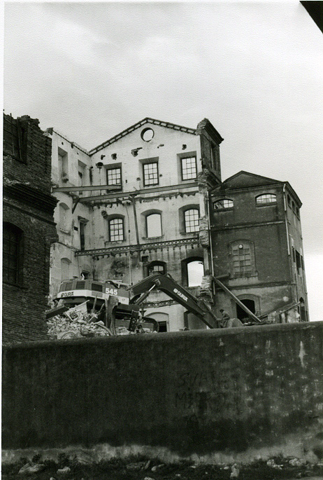Vista de l'edifici de la fàbrica durant el seu enderroc.