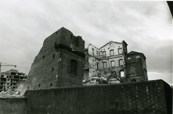 Vista de l'edifici de la fàbrica durant el seu enderroc.
