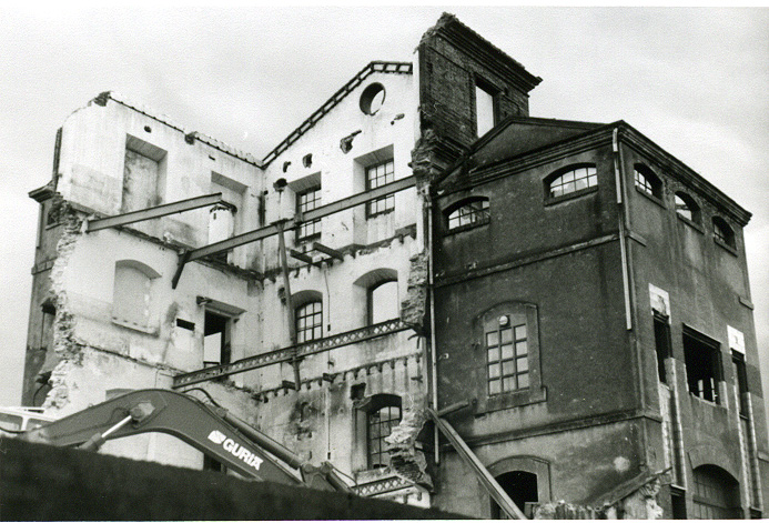 Vista de l'edifici de la fàbrica durant el seu enderroc.