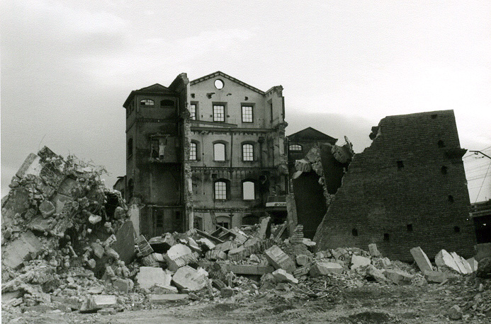 Vista de l'edifici de la fàbrica durant el seu enderroc.