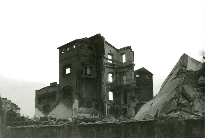 Vista de l'edifici de la fàbrica durant el seu enderroc.