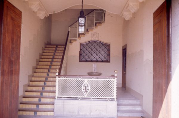 Perspectiva de l'escala i vestíbul d'entrada a l'edifici. A la imatge s'aprecia la barana de forja i la làmpada del sostre, dissenys de Rafael Masó.