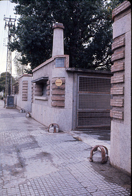 Vista de l'entrada a la farinera amb la paret de tanca i caseta del guarda projectats per Masó l'any 1932.