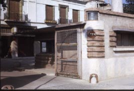 Vista de l'entrada a la farinera amb la paret de tanca i caseta del guarda projectats per Masó l'any 1932.