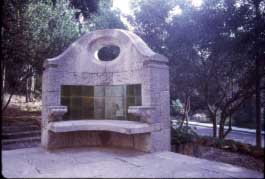 Vista general del banc amb revestiment ceràmic verd, que en la seva part posterior és una font.
